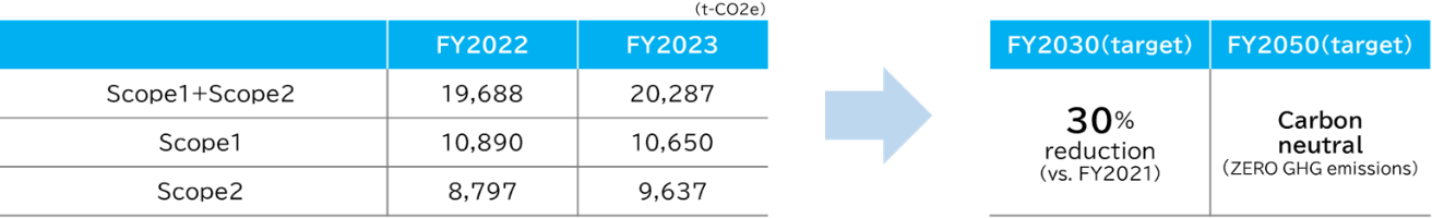 At the same time, we intend to conform to the long-term goals set out in the Paris Agreement: holding the increase in the global average temperature to below 2°C above pre-industrial levels and working to limit the temperature increase to 1.5°C above pre-industrial levels. We will also do our best to meet the Japanese government’s goal of reducing GHG emissions to net zero, or realizing carbon neutrality, by 2050. So, we have set the target of achieving a 30% reduction in GHG emissions (compared with the FY2021 level) by FY2030, in a bid to achieve sustainability. Looking ahead, we are considering calculating Scope 3 emissions to track emissions for our entire supply chain.