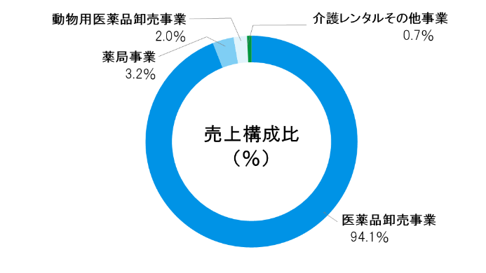 医薬品卸売事業においては、薬価改定の影響や局地的なエリアの限定的なセグメントにおいて、競争入札を要因とする売上減少などによるマイナスの影響はあったものの、抗がん剤を中心とした新薬創出加算品やインフルエンザワクチン等の季節商品の販売に注力したことなどが減収分を上回り増収となりました。一方、利益面においては、前述の競争入札による売上減少の影響のほか、販売管理費の増大により減益となりました。以上の結果、売上高は436,971百万円(前年同期比100.6%)、セグメント利益(営業利益)は、3,816百万円(前年同期比75.2%)となりました。