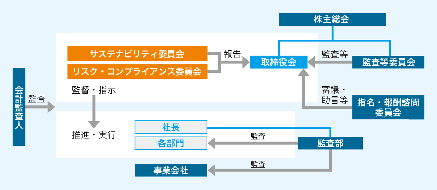 バイタルケーエスケー・グループでは、経営上のリスクの発生自体を予防する「未然の防止」と、リスクが発生した場合に状況を把握し、迅速かつ適切に対処する「影響の最小化」を目的に、リスク管理規程を策定し、リスクマネジメントを実施しています。グループ全体のリスクマネジメントとコンプライアンスの徹底を図るため、「リスク・コンプライアンス委員会」を設置し、原則として年2回開催しています。同委員会での決定・報告事項は、事業会社の同様の委員会委員長より各事業会社へ伝達され、グループ全体に周知されています。また、サステナビリティ委員会においては、気候変動関連を含むサステナビリティ関連のリスクと機会についての戦略策定や目標設定、リスク管理を実施するとともに、その内容を取締役会へ報告することとしています。